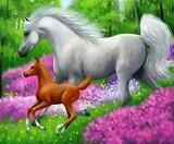 «Белая лошадь с жеребёнком в цветущем лесу»
